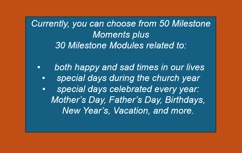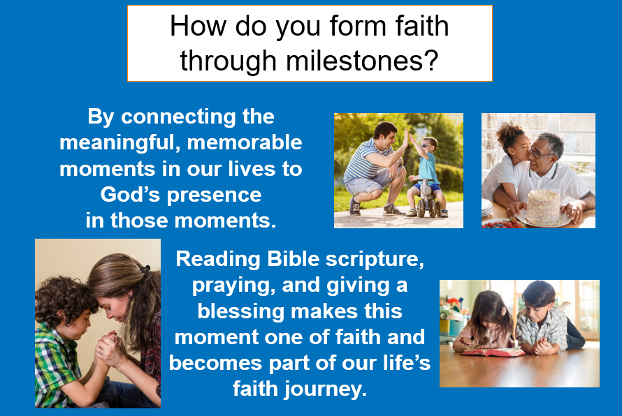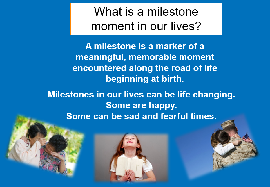 Milestone moments in our lives happen daily. Milestones Ministry provides a means to recognize those moments and help us grow in the Christian faith. Naming the moment and taking time to have a trusting, caring, non-judgemental conversation in a setting for all ages is important. It builds memories and strengthens relationships.