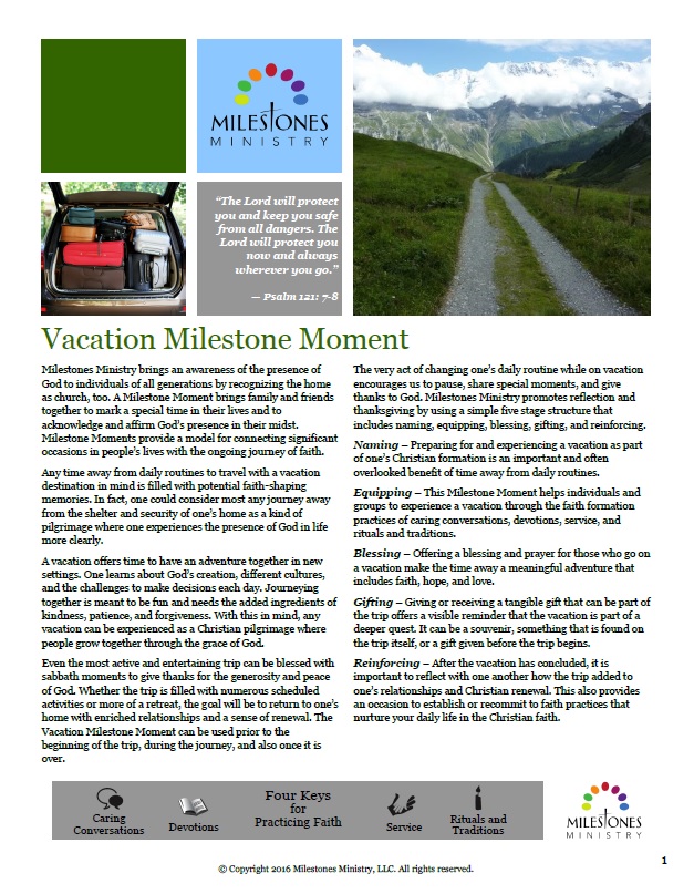 Milestone Moments include an easy-to-use design and one page Discussion Guide that promotes Christian faith formation with family and friends. Milestone Moments are experiential and engage participants in the Four Key Faith Practices of caring conversations, devotions, service, and rituals and traditions. To make the moment more memorable and, therefore, capable of nurturing the life of faith, each Milestone Moment includes the Four Key Faith Formation Discussion Guide, a blessing, and a suggested gift idea to remember the moment. It also provides the recommendation for a follow up experience to reinforce the importance and impact of this moment for the life of faith. Together, these elements offer a complete faith formation experience that will bless people’s journey of faith for a lifetime.